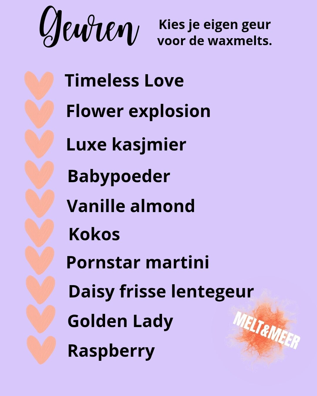 Wat Melt&Meer uniek maakt, is het leuke design van onze producten en de mogelijkheid om je eigen geur te kiezen. Onze wax melts worden op maat gemaakt, zodat je altijd een persoonlijke touch hebt.